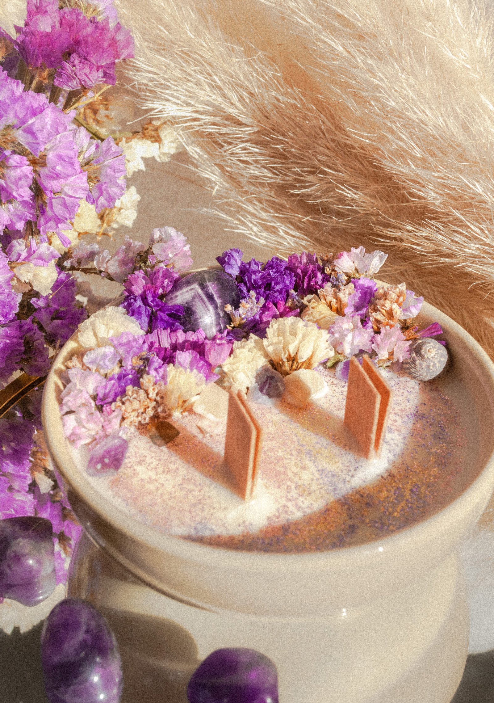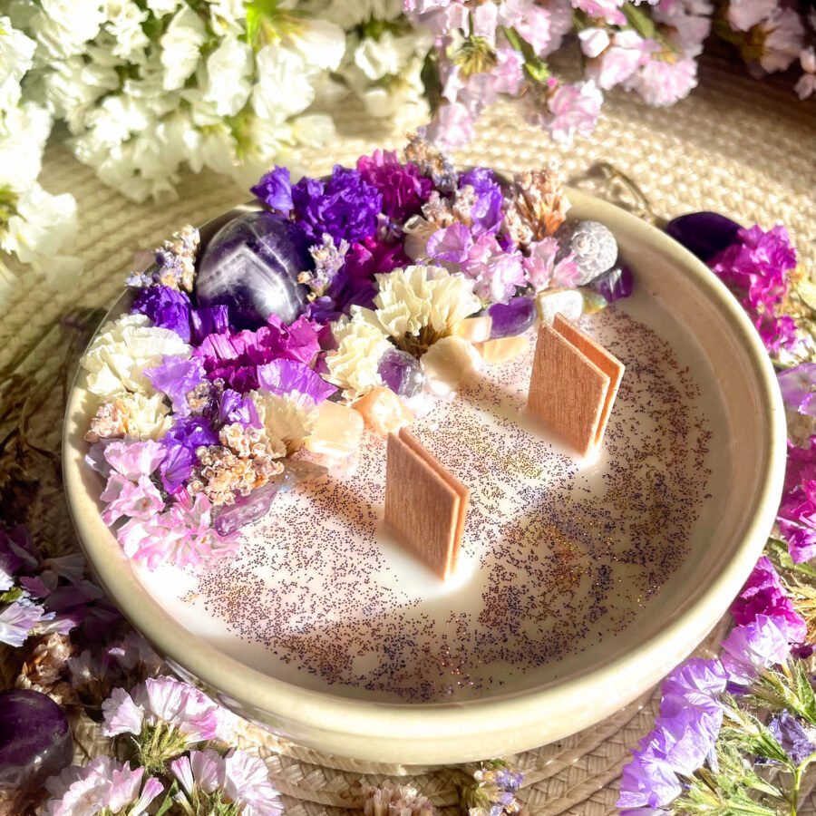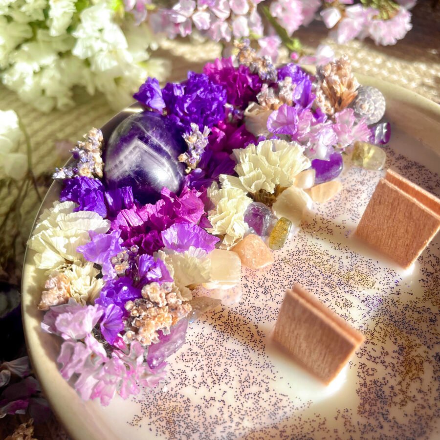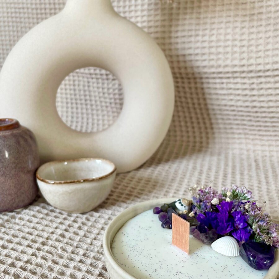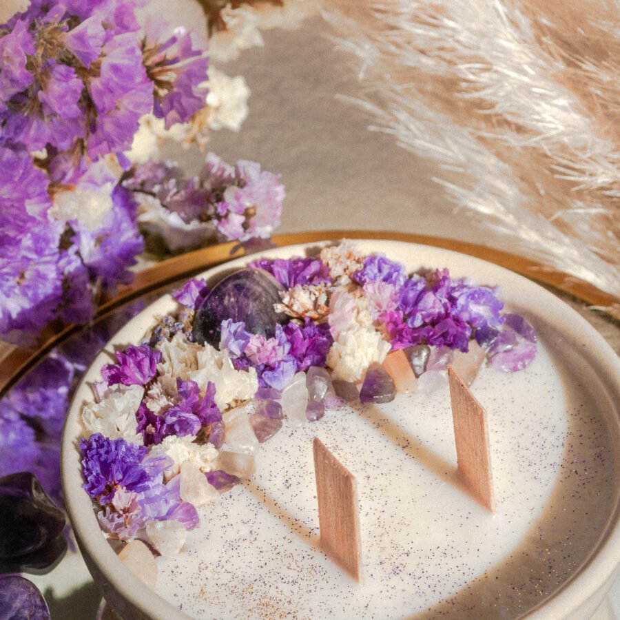 Mais, qu’est-ce que c’est une bougie énergétique ? C’est une bougie chargée d’une énergie, grâce à un minéral, et à l’intention qui lui est associée durant sa création, et son utilisation. Chaque bougie Purple Moon est unique, autant par la composition florale qui orne sa surface, que par l’unicité de la pierre qui est sollicitée. Plus qu’un objet de décoration, c’est une invitation à vous recentrer.