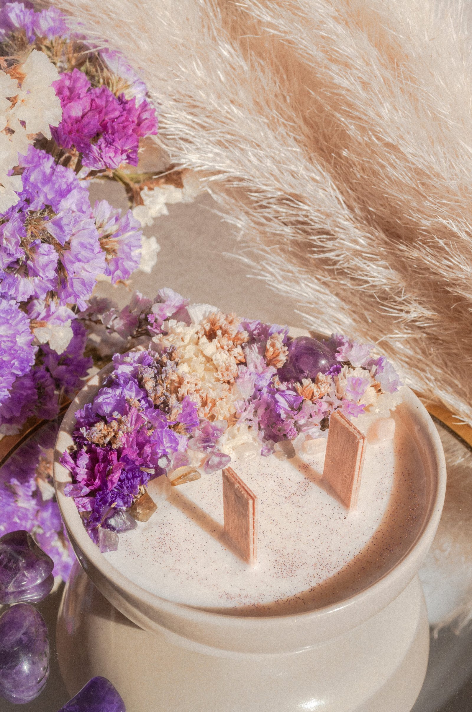 La bougie précieuse l’Apaisante est composée d’une pierre semi-précieuse d’améthyste et de cristaux naturels d’améthyste, de pierre de lune et de labradorite. Parfumé avec des fragrances naturelles de mûre, de violette, et de fleur de tiaré, elle est également décorée de fleurs séchées telles que la gypsophile, la lavande, le limonium, le statice … Chaque bougie est unique et faite à la main, on trouve donc des différences entre les différents modèles.