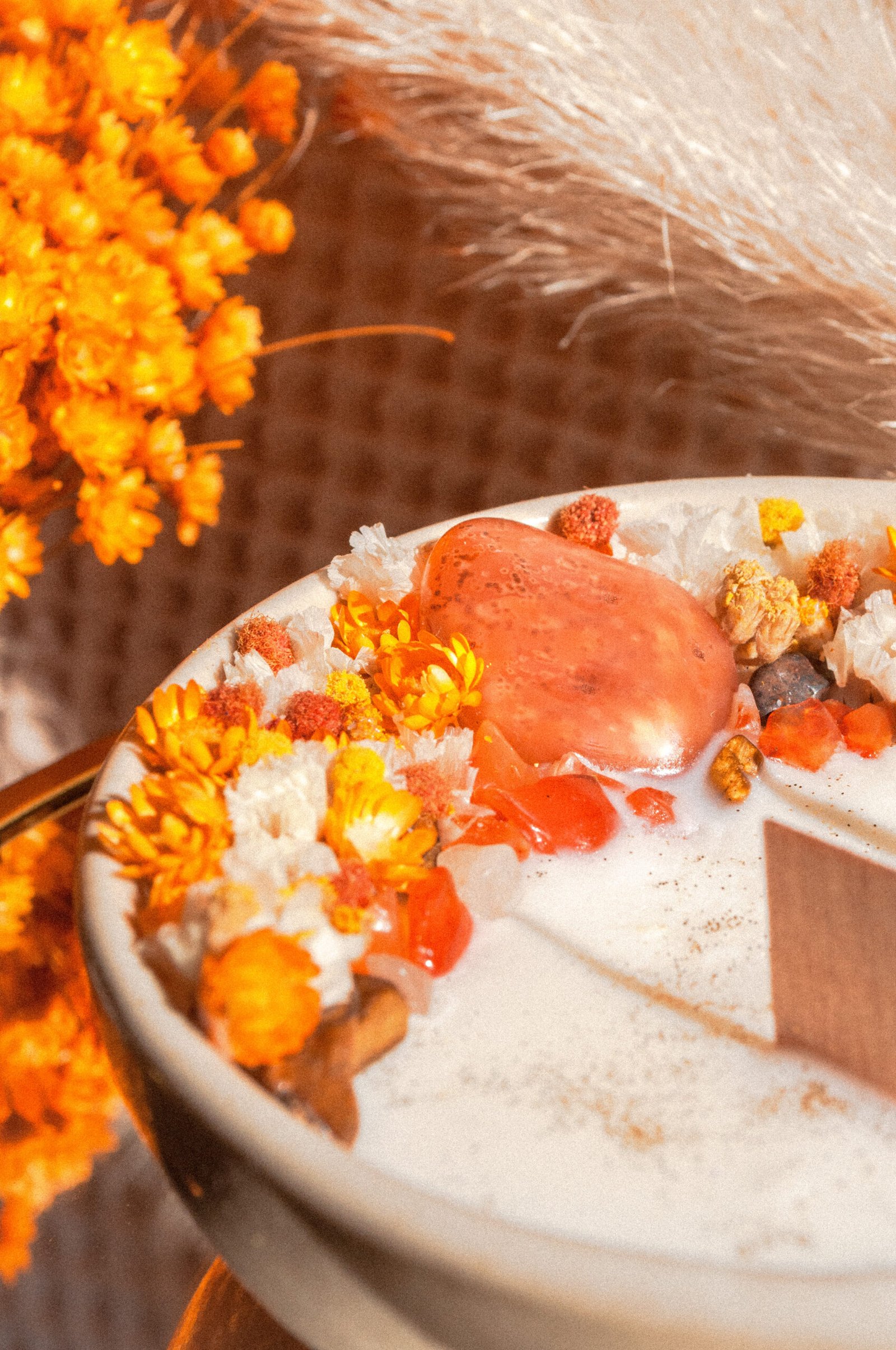 - LA PIERRE : La bougie est ornée d’éclats de cristaux de cornaline, de pierre de lune et d’oeil de tigre; ainsi que d’une pierre roulée semi-précieuse de cornaline, fournie par une boutique ésotérique locale. La cornaline est la pierre de la bonne humeur et de la vitalité. Energisante, elle favorise la paix intérieure et l’épanouissement. Elle apporte confiance en soi et assurance.